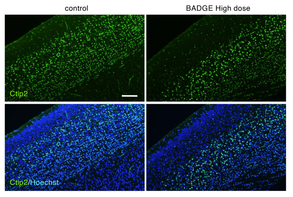 我々はこれまでに,BADGEを妊娠・授乳期に投与した母体からの新生仔は頭頂皮質第2/3層細胞数が低下し,第5層Ctip2陽性錐体細胞が対照群と比べより第5層に限局することを見出し,高濃度のBADGEへの曝露は,早期の神経分化をもたらす可能性を示しました.