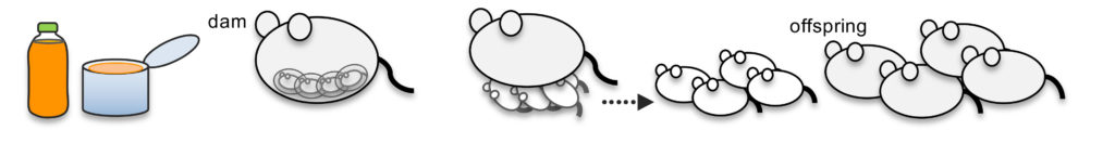 プラスチック容器や缶詰,飲料缶の内面コーティング剤として用いられているエポキシ樹脂Bisphenol A diglycidyl ether (BADGE)は,微量ながら食品中へ移行することが知られており,エストロゲン様活性が報告されています.私たちは母胎へのBADGE曝露による産仔脳発達への影響について研究しています.